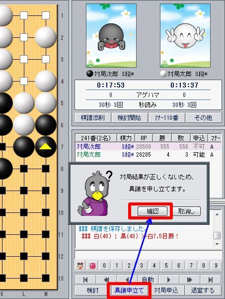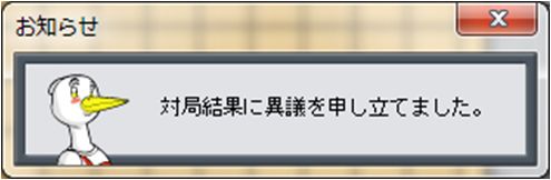 「異議申立て」の内容は自動的にサポートセンターに伝えられ、あとでサポートセンターより再判定が行われ、棋譜や成績などが修正されます。